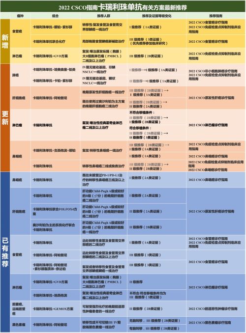 卡瑞利珠单抗有关方案,在2022 CSCO诊疗指南中获得的临床推荐最多,既有基于最新医学证据获得的新增推荐,亦有证据等级提升后推荐等级提高。