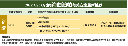 海曲泊帕乙醇胺片作为我国自主研发上市的新一代的TPO-RA类药物,已获批免疫性血小板减少症(ITP)和重型再生障碍性贫血(SAA)两个适应症,已进入国家医保目录,其治疗CTIT的临床研究正在进行中。首次发布的CTIT诊疗指南推荐包含海曲泊帕乙醇胺在内的TPO-RA,用于治疗CTIT有出血、CTIT无出血(血小板计数(PLT)≤10×109/L和10×109/L<plt<75×109/L),推荐级别均为II级(2B类证据)。