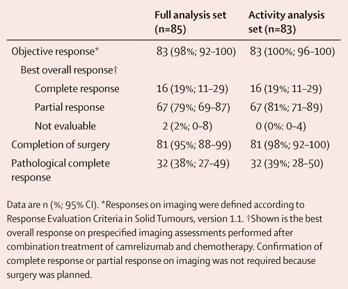 FAS集人群,85例患者ORR为98%,16例达到CR,pCR为38%。2例患者接受卡瑞利珠单抗治疗后退出未进行影像学评估。AAS集人群,所有患者疾病均得到缓解,ORR为100%,16例达到CR,pCR为39%(表2)。