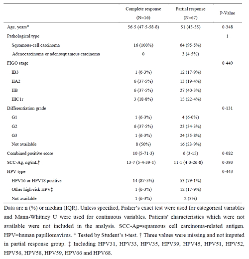 事后亚组分析显示:CR组和PR组患者在年龄、病理类型、FIGO分期、分化分级、HPV状态等方面均无显著差异,虽然CR组患者CPS评分略高,但是差异无统计学意义(P=0.082)(表3)。