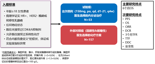 本研究为一项多中心、外部对照的Ⅱ期临床试验,试验组采用Simon两阶段设计,旨在评估达尔西利联合内分泌治疗在HR+/HER2-晚期乳腺癌伴内脏危象患者中的疗效与安全性。