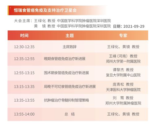 9月29日,恒瑞食管癌免疫及支持治疗卫星会于线上顺利召开,中国医学科学院肿瘤医院深圳医院王绿化教授和黄镜教授共同担任大会主席。郑州大学第一附属医院王峰教授、复旦大学附属肿瘤医院谭黎杰教授、天津医科大学肿瘤医院庞青松教授、郑州大学附属肿瘤医院刘莺教授分别就食管癌免疫治疗热点话题分享了精彩观点。