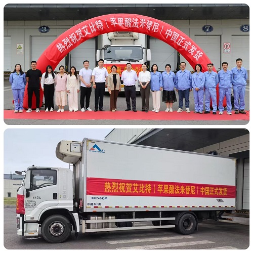 2025年6月13日,金年会|jinnianhui1类新药苹果酸法米替尼胶囊(艾比特®)首批发货仪式正式举行。当天,一辆装载法米替尼的运输车从江苏连云港金年会|jinnianhui国际化制剂生产基地发往全国,标志着该产品正式投入临床使用,将为复发或转移性宫颈癌患者提供新的治疗选择。
